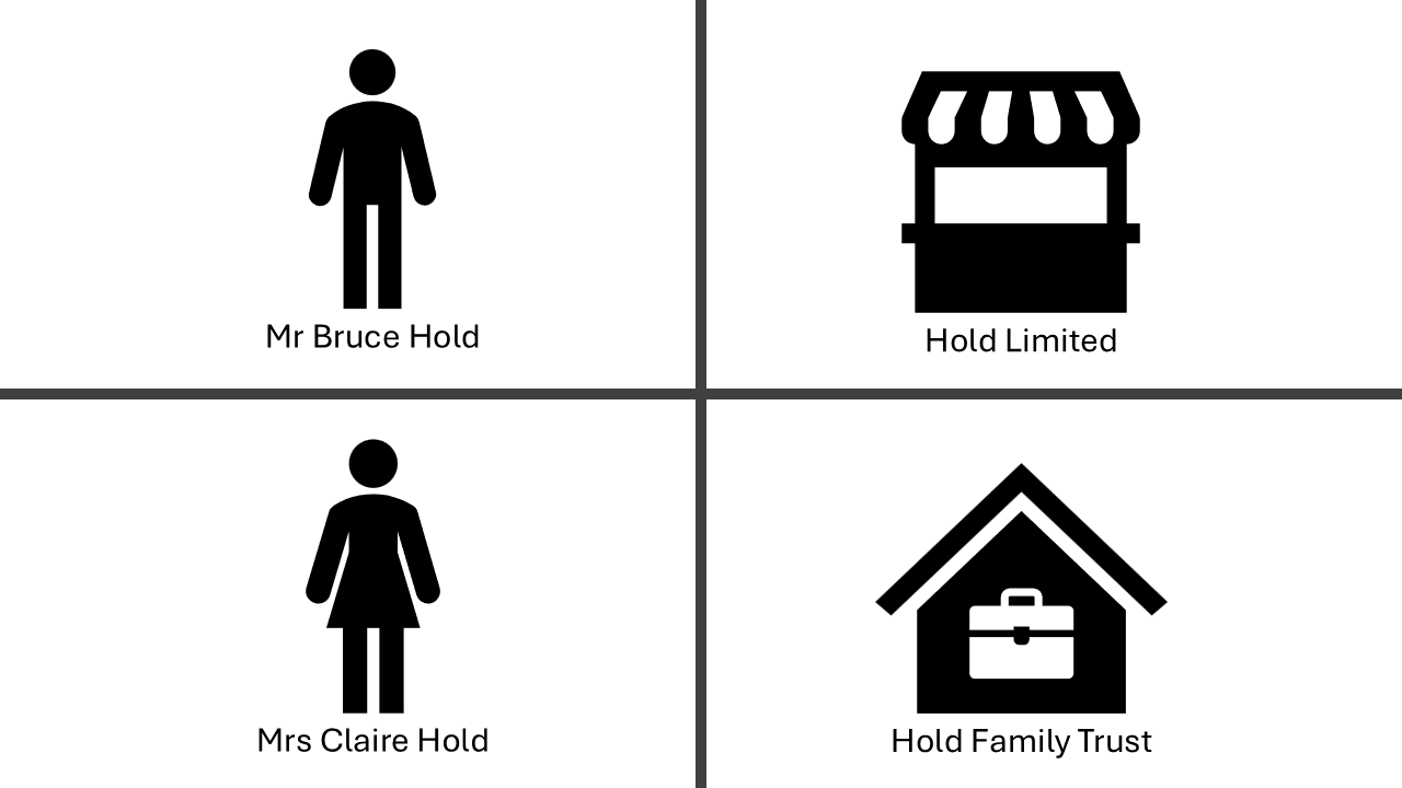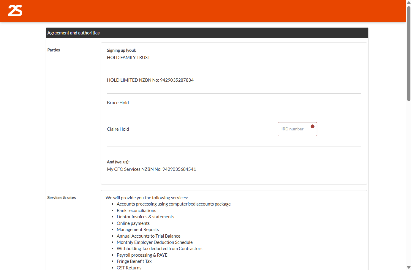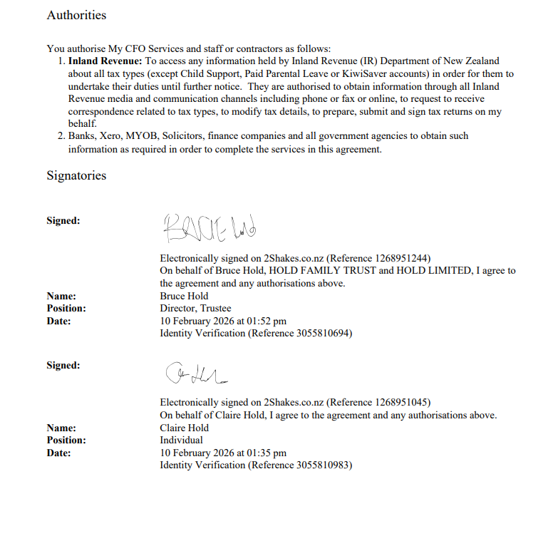 Bruce and Claire Hold run a (fictitious) business together and a family trust. They engage My CFO Services Limited (again, fictitious) to help with all their tax needs - for the company, the trust and each of their personal tax accounts. That means four IR numbers must be authorised, and the four clients make up a multi-entity agreement.