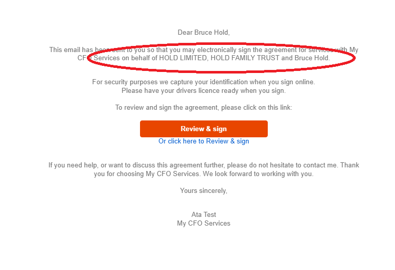 Each signatory receives their own unique signing email. Here is what Bruce Hold sees: