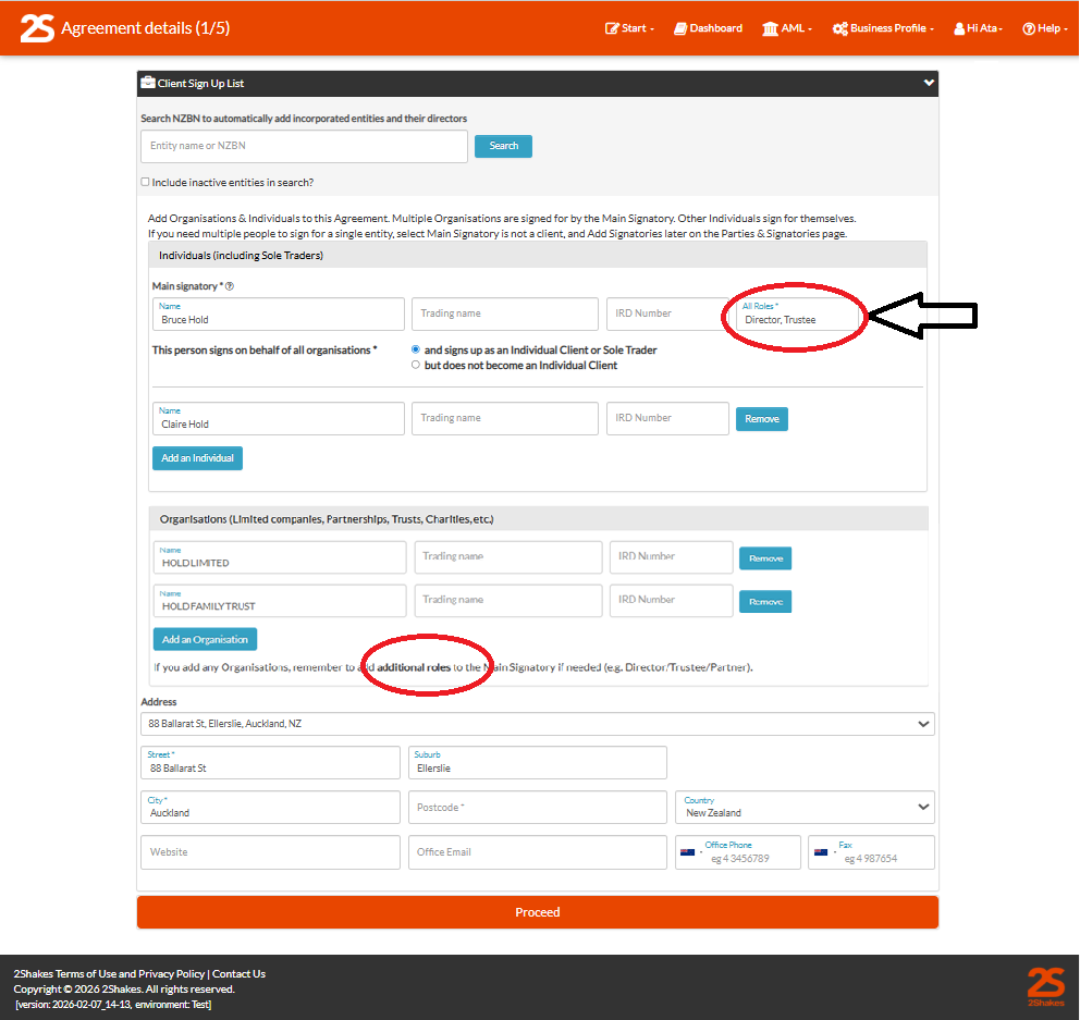 When you look up a company like Hold Limited using the NZBN search wizard, 2Shakes automatically imports company details and directors. It shows you that Claire and Bruce are directors, letting you select Bruce as the main signatory. Selecting a director as the main signatory also automatically pulls their Director role into the “All Roles” field.