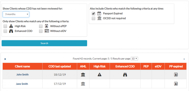 In the example above, the search is for clients whose CDD has not been reviewed for 3 months AND any clients whose passports have expired. Even though the two clients’ CDD has been updated within 3 months, they show in the report because they have expired passports. The OCDD report also tell us: